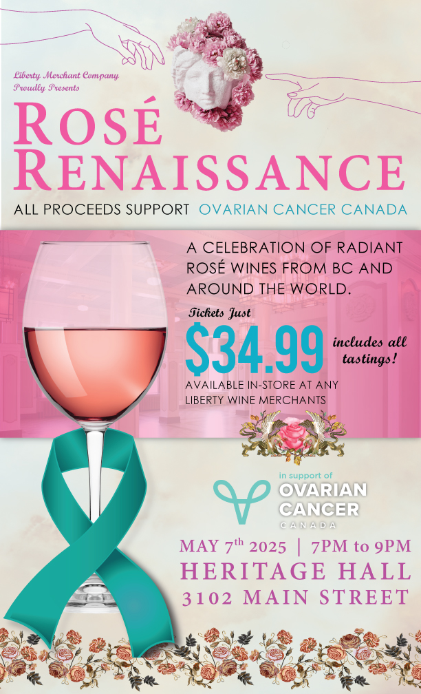 Liberty Merchant Company proudly present the 15th Annual Rosé Renaissance Tasting in support of Ovarian Cancer Canada. To date, we have raised $44,886 for Cancer Research in BC and Canada.